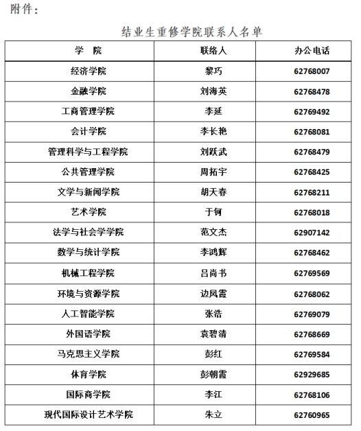 为便于及时接收相关通知和安排,准确填报重修课程,请联系专业所在学院(联系方式见附件),加入对应的企业微信群,咨询相关事宜。