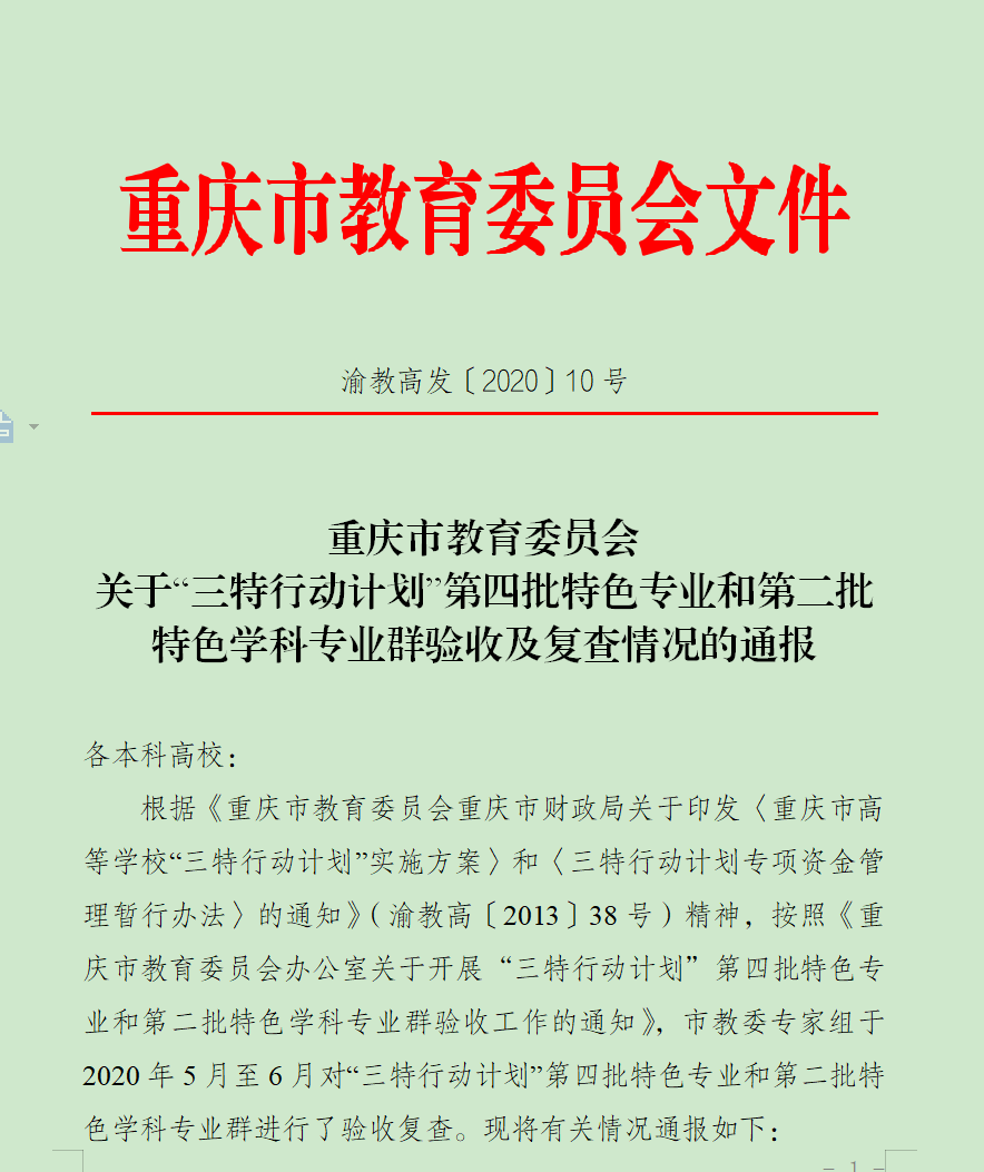 近日,重庆市教育委员会公布了《关于“三特行动计划”第四批特色专业和第二批特色学科专业群验收及复查情况的通报》(渝教高发 [2020] 10号),开云官网第四批4个特色专业审计学、物流管理、劳动与社会保障、机械设计制造及其自动化,以及2019年验收暂缓通过的广播电视学专业全部顺利通过验收。