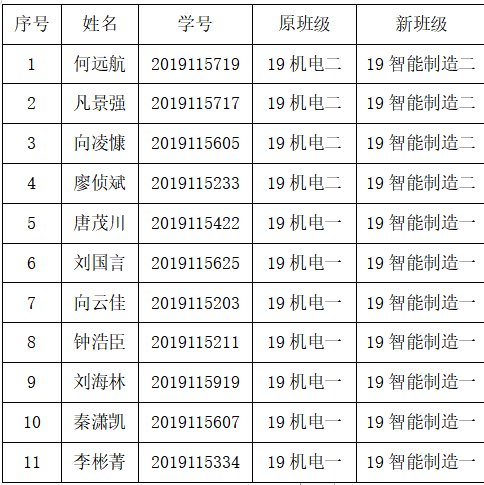根据学院向教务处提出2019级机械电子工程专业进行二次分流的申请,教务处同意在机械电子工程专业内部进行学生班级调整。经11月16日学院党政联席会研究,结合大家第1学期成绩排序,同意2019机电班级11人申请转入2019级智能制造班级。现将二次分流确认名单予以公示。
