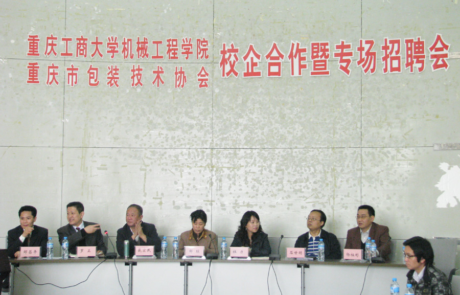 4月19日上午,机械学院联合重庆包装技术协会(下称重庆包协)在启智楼多功能厅举办了校企合作暨包装行业专场招聘会。中国包装联合会科学技术委员会主任、中国包装教育委员会副主任戴宏民教授、重庆包协秘书长邹琼、招生就业处石世明处长、机械学院罗卫书记、杜力院长、杨祖彬、邹昌平副院长等领导出席了本次专场招聘会。