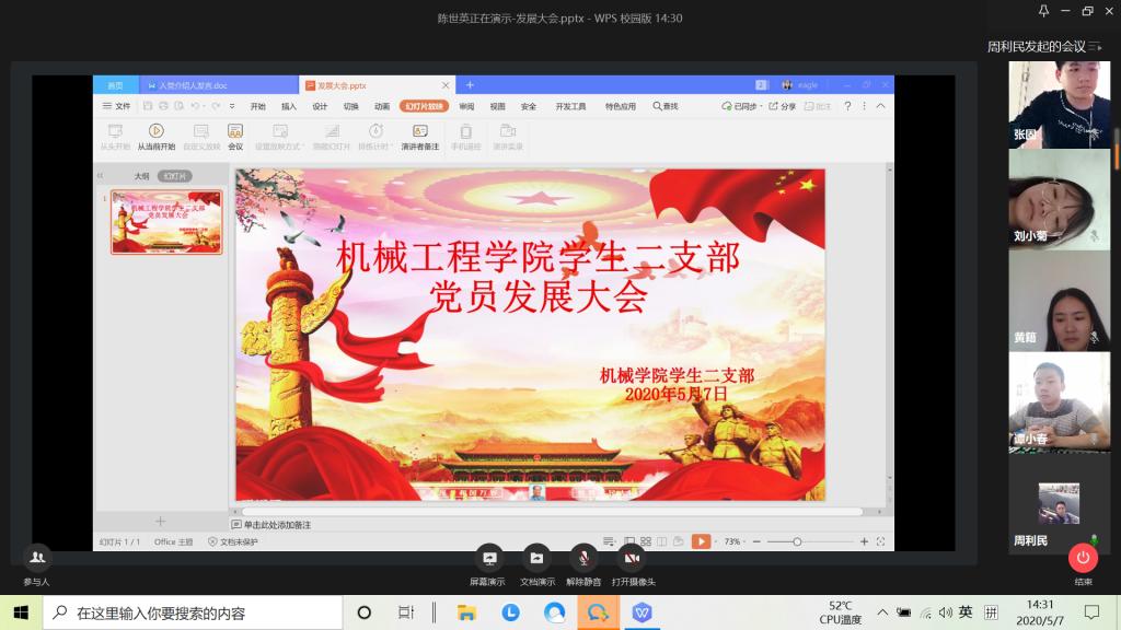 2020年5月7日(周四)下午14:20,开云kaiyun官方网站学生二支部通过企业微信视频会议模式开展了五月第一批的党员发展大会,支部全体党员参加了此次大会,会议由支部书记周利民主持。