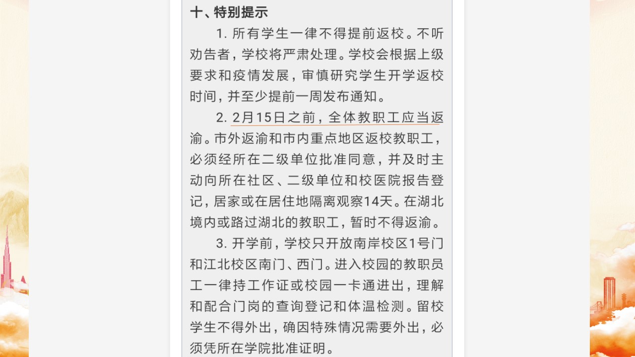 这场战役还在继续,我们的防疫工作也还在继续。我想我们能做的就是积极配合国家的防疫工作,坚守好自身的岗位职责,虽不在抗疫一线,但也身在抗疫后方。相信这场战役对在场的每一位同志都是人生中特殊的经历,幸运的是此时的我们还能健康的在岗位上为社会奉献出自己的力量。这就是我作为一名母亲,一名辅导员,一名中共党员平凡的故事,但因为有我的孩子,我的学生,有那么多在战役中舍身为人的党员同志,使得身处不同的身份的我,所有付出都有了意义。希望社会早日回归正常秩序,希望宁静的校园早日恢复勃勃生机。感谢大家的聆听,谢谢。