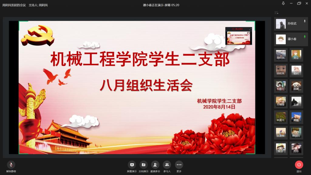 夏日炎炎,线上组织生活会犹如一杯凉茶,给同志们带来消暑的效果,在浮躁中静下来学习。8月14日上午10:30,开云kaiyun官方网站学生二支部通过企业微信会议模式开展了八月组织生活会,会议由支部书记周利民主持,支部全体党员参加。