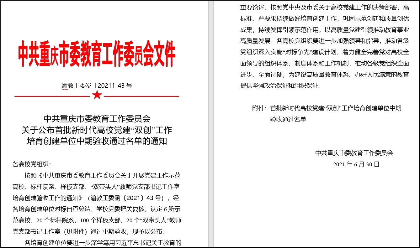 近日,重庆市教委发布了关于公布首批新时代高校党建“双创”工作培育创建单位中期验收通过名单的通知,开云kaiyun官方网站教工第一党支部顺利通过全市首批样板支部培育单位中期验收。