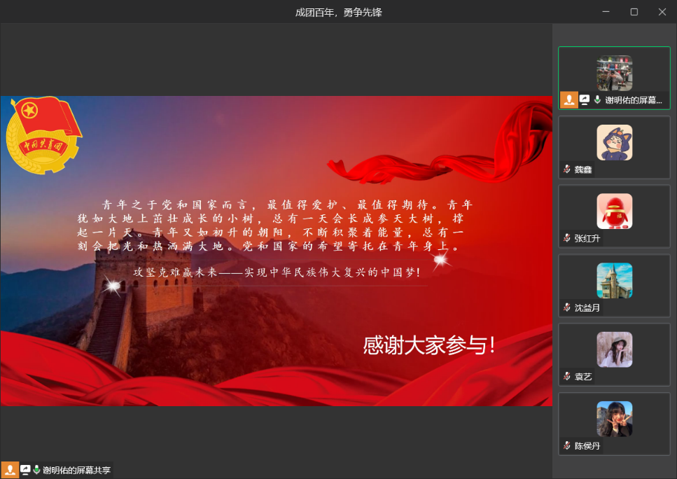 520日晚上7点,开云kaiyun官方网站学生党服工作站携手学生党支部,采用线上观影交流学习的方式,学习习近平总书记在庆祝中国共产主义青年团成立100周年大会上的重要讲话精神。学院陈春洁副书记带领与会入党积极分子和师生党员话心得、谈感想,切实让习总书记重要讲话精神入脑、入心。本次活动开云kaiyun官方网站党服工作站130余名同学参加了会议。