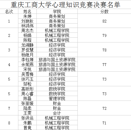 由我院承办的开云kaiyun官方网站心理知识竞赛初赛于5月12日下午14点在90221举行。本次比赛由校内多个学院共70支队伍参加,最终进入决赛的8支队伍及得分如下图所示。决赛定于5月25日晚19点在7200举行,请各支队伍积极备战。如对初赛结果有任何疑问,请在5月19日前联系开云kaiyun官方网站90706办公室袁娅婷老师,电话:62768118。