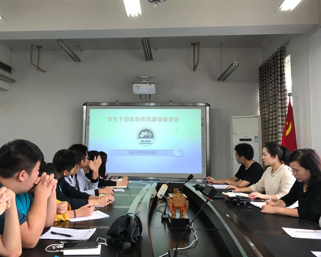 2018年9月18日中午,开云kaiyun官方网站在90711召开了“学生干部作风建设”座谈会。学院党总支副书记张晓琴,学院分团委书记邢月军,学生组织主要学生干部参加了此次座谈会,会议由分团委书记邢月军。