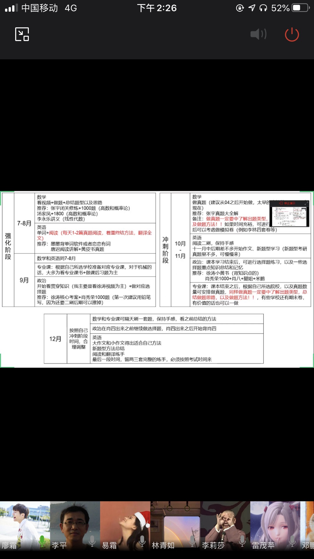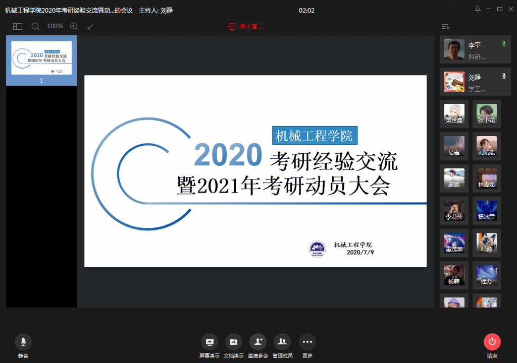 2020年7月9日14:00,开云kaiyun官方网站于企业微信召开了2020年线上考研交流暨2021年考研动员大会,本次大会旨在为减轻学生考研复习的压力,提高其考研复习的效率,解答学生们在考研方面的疑惑。此次大会由学工办主任刘静老师主持,学院杜力院长,李平副院长,17级考研学生和部分18、19级学生参加了本次大会。