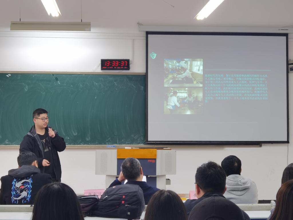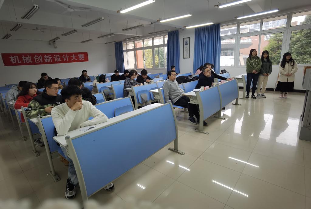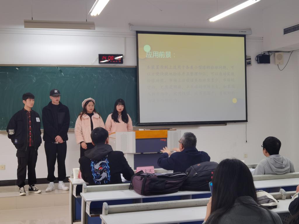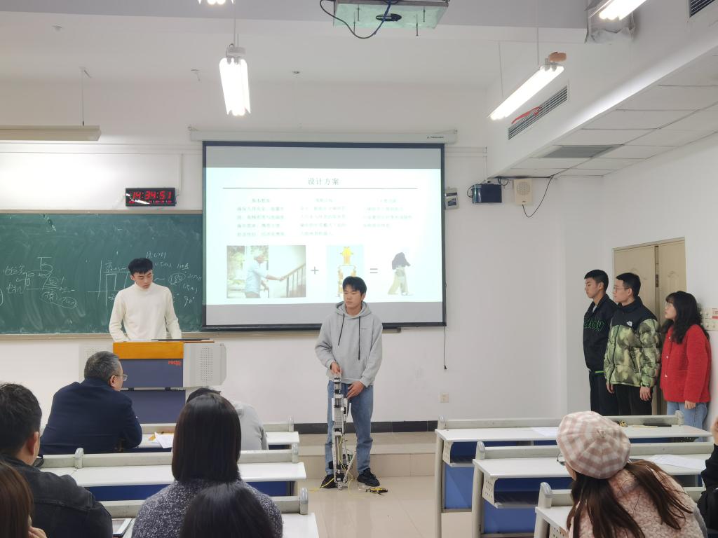 本次比赛的决赛共有六组同学成功晋级,评委黄勇刚老师简要为参赛者们讲解了比赛流程与细则,并宣布比赛正式开始。展示过程由各个成员团结协作共同完成,每个小组派出一名主要讲解员,依次上台借助PPT、三维建模以及实物展示等多种方式展示自己的设计作品。评委老师们在展示完成后对参赛小组进行提问,从多面角度对他们的作品给予改良建议和鼓励。全部小组展示和答辩完成后,评委老师们再根据小组作品以及答辩的完成情况给出最终评分并进行排名。在此次比赛中涌现出了各种各样创意十足的作品,如餐具自动回收机,便捷式坐便器,自动捡球机等等。这些源自生活的设计作品,充分地体现出锻炼学生实践动手和科技创新能力的比赛目的。