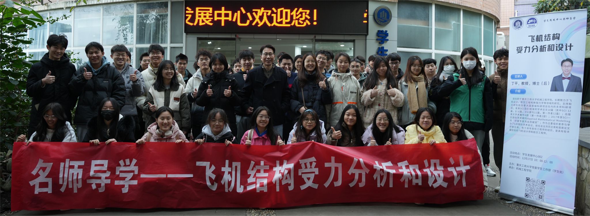 上午10:00,丁平教师在学生发展中心002会议室开展力学知识讲座,为同学们介绍飞机结构受力分析和设计。丁平教师在讲座中为同学们介绍了飞机的各个结构及其作用,还与同学们分享了一些飞机的基本知识,他指出飞机结构的受力分析与设计,对飞机的安全性和性能有着至关重要的影响,并提出用筷子承重也应该对筷子进行合理的受力分析与设计。讲座结束后,丁平老师与同学们在学生发展中心门口合影留念。丁平老师的讲座极大的激发了同学们对力学知识的兴趣,有几位同学在合影散场后还意犹未尽,拉着丁老师一边走一边探讨。