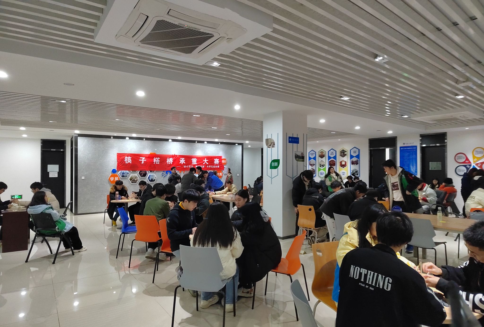 下午14:00,筷子搭桥承重大赛在学生发展中心大厅准时开始。共有34个小组参赛,在此之前裁判已向参赛选手宣读比赛规则,各组参赛选手需要在规定的时间内用橡皮筋将筷子连接成合理的结构,并接受矿泉水承重测试,瓶数多者胜出。参赛选手们首先对现有材料进行分析,讨论结构方案,随后进行搭建,在此过程中不断进行测试、调整。下午15:30搭建时间结束,比赛裁判组织各小组轮流将自己的作品拿到评审区,用每瓶550ml的矿泉水为单位进行承重测试,最终2组与17组分别以98瓶和60瓶的优异成绩获得一等奖,3个小组获得二等奖,7个小组获得三等奖。