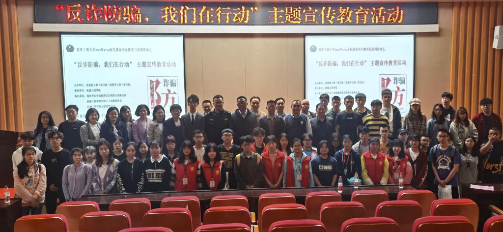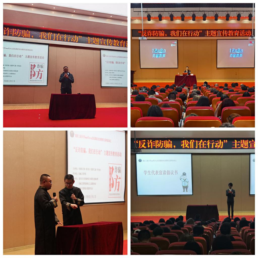 主题宣传活动在党委保卫部钱忠坤处长的主题讲话中拉开帷幕。重庆市公安局南岸区局四公里派出所刘国魁警官做了《高校通讯网络诈骗的宣传与防范》专题讲座,他从通讯网络诈骗的特点、发案形式、高校发案现状和宣传策略四个方面向同学们进行了详细讲解。其中,针对大学校园中易出现的“杀猪盘”、刷单返利、冒充电商客服等诈骗手段,他用幽默风趣的视频形象的描述了电信诈骗给受害人带来的巨大伤害,告诉大家应该如何甄别诈骗行为。同时,刘警官也总结了目前几种大学生容易出现的犯罪行为,并用案例对现场的同学进行了警示教育。讲座结束时,学生代表上台宣读了倡议书。活动现场,学生们创新形式,用相声表演的形式,形象、生动地演绎了当前网络诈骗常见的手段套路,让同学们在欢声笑语中学习到了防骗反诈知识,收到了师生们的一致好评。