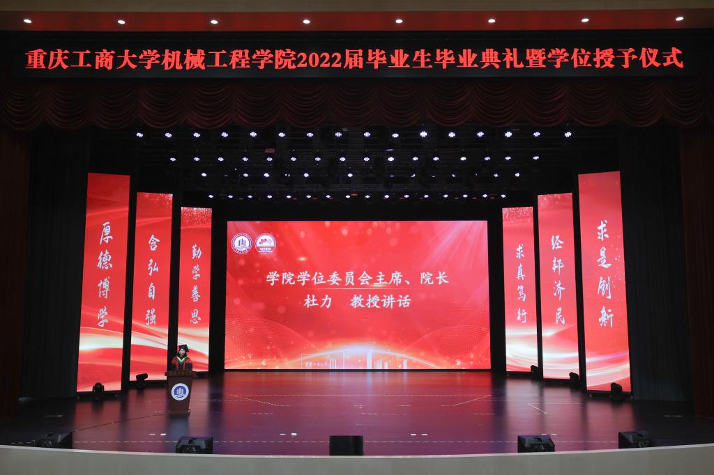 学院学位委员会主席、院长杜力向无私奉献的老师们表示诚挚的敬意和衷心的感谢,并寄语青年学子们:带着整齐的行囊和良好的心态离开学校;带着专业的烙印、梳理过的知识体系离开学校;学会用“匠心精神”做事做人,这是人生长跑的方向盘和动力源。