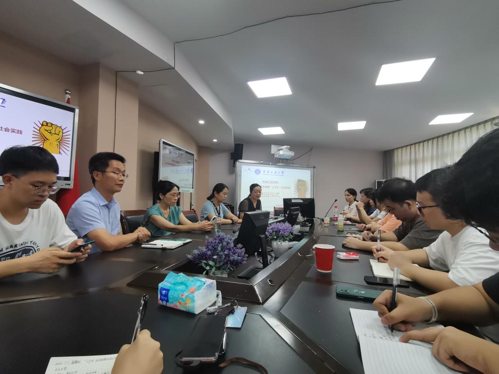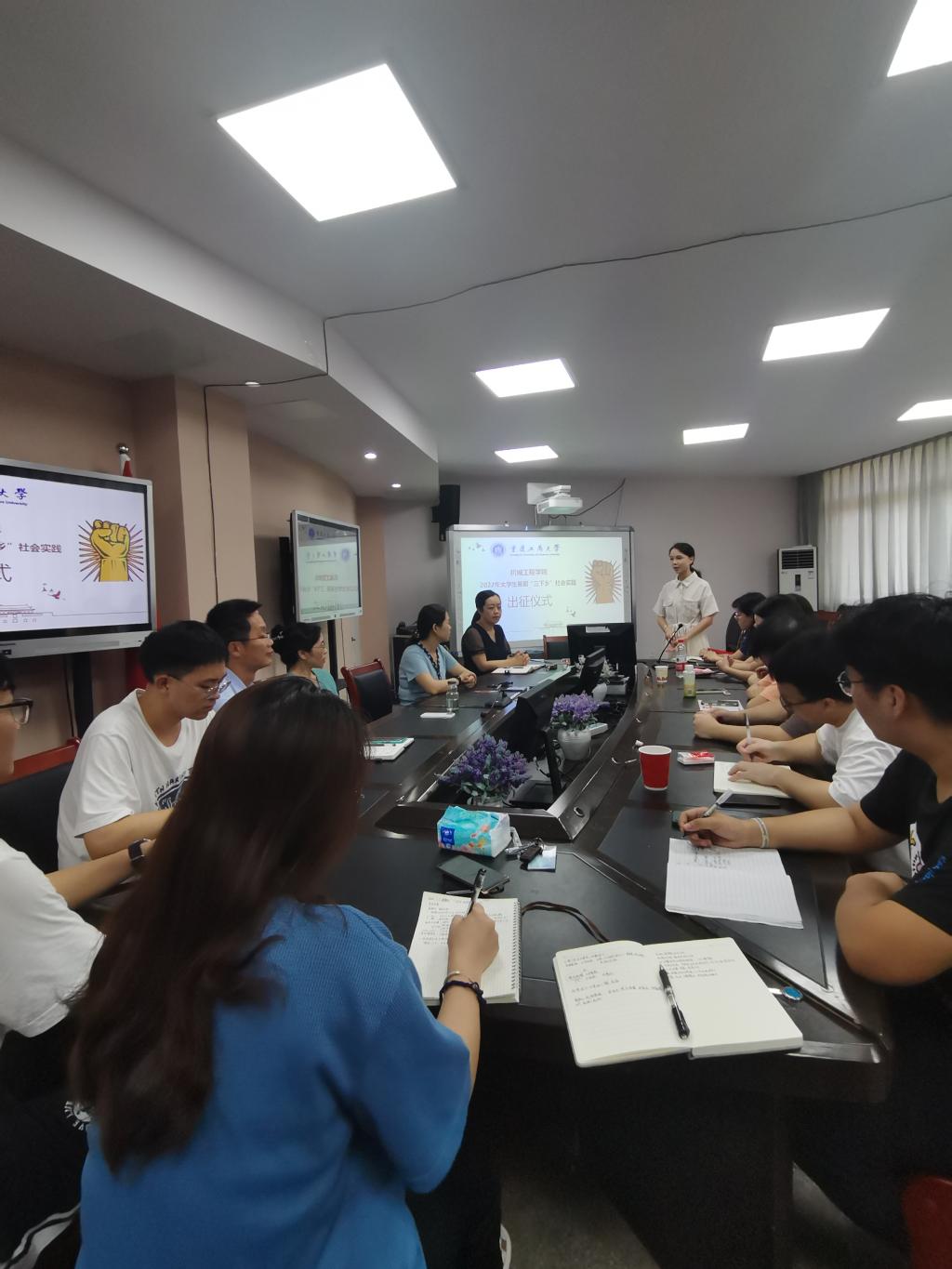 学工办主任刘静作为带队老师介绍暑期社会实践整体情况,她从“一纵一横”两个方面介绍了2022年学院社会实践工作整体安排,并就学院分团委在思想下乡、科技下乡、教育下乡三方面的工作任务做了详尽的介绍。