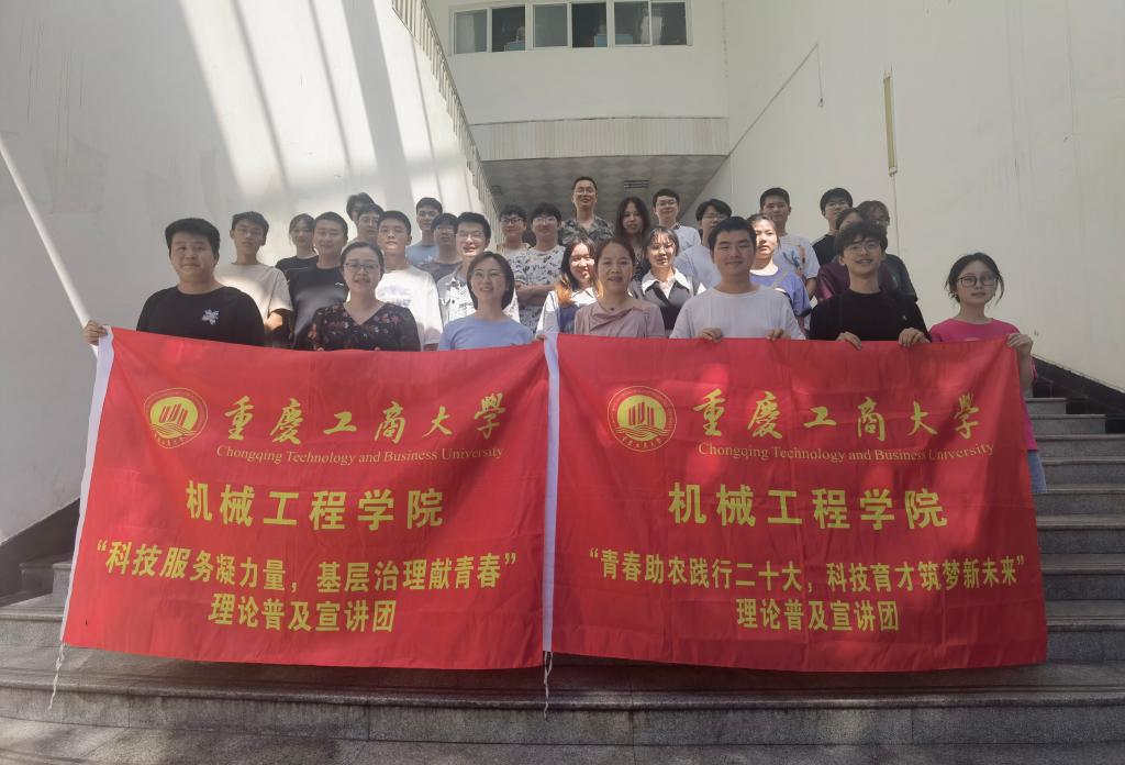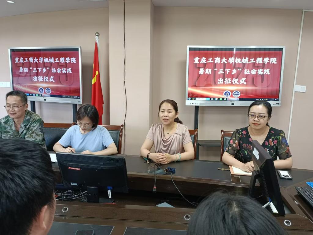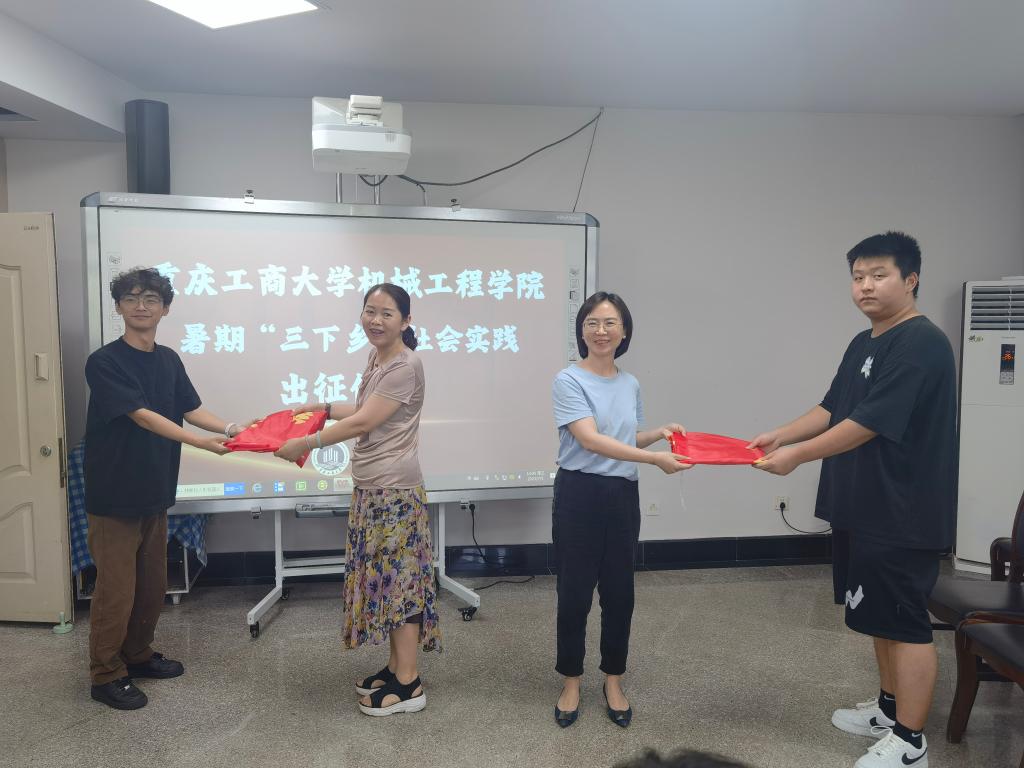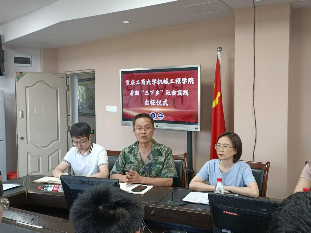 学院团委书记刘静充分肯定学院历年来暑期社会实践取得的丰硕成果,并简要介绍实践活动整体安排。本次社会实践活动涵盖内容丰富,包括机械创新设计大赛农副产品专题调研与需求对接、青少年之家科普课堂及党史红色教育宣讲等。社会实践市级专项团学生负责人董亮星、黄丰发言,表示实践团将克服困难,团结协作,全力以赴,力争圆满完成各项实践任务。随后,学院领导为社会实践团授旗。学院院长杜力提出两点希望:第一,本次社会实践有特色、有亮点,实践团成员应把握机会,积极发挥专业知识赋能乡村振兴,埋下科技种子,扎根科技报国信念,点亮乡村儿童科技强国梦;第二,注重个人言行,积极展现重工商大学子饱满的精神状态和昂扬的精神风貌。学院党委书记杨娟代表学院发表重要讲话,提出四点要求:一是“看”,静下心仔细观察,在实践中出真知;二是“学”,摘下大学生的光环,虚心向农户与社区人员学习,在实践中长真才;三是“思”,善于发现别人的需求,找到供需结合点,实现自我价值;四是“做”,做好前期规划和后期总结,丰富信息来源渠道,充分展现社会实践成果。