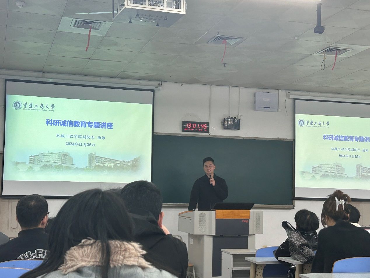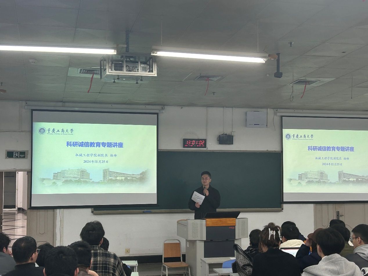 主题班会的第一阶段以“铸就科研之魂,坚守诚信之道”为主题,学院科研副院长杨帅教授为同学们做了诚信科研教育专题讲座,在这个创新驱动发展、科技日新月异的时代,每一份科研成果都承载着推动社会进步与产业升级的重任。 杨帅围绕学校关于学术诚信相关文件在宣讲时指出,在追求科研高峰的道路上,诚信如同一盏明灯,照亮着研究者前行的方向,确保科学探索的每一步都坚实可靠,同时,杨帅通过深度对话和今年在学院评选奖学金中出现的关于论文署名的具体事例等生动案例,为机械专业的研究生们树立正确科研观念,强化诚信科研意识,为未来的科技征途奠定坚实的基础。杨院长详细阐述了诚信科研的重要性,从学术不端的严重后果到诚信科研对个人职业生涯的正面影响,通过一系列真实的科研诚信案例,深入浅出地分析了诚信缺失对科研生态造成的破坏,以及如何在日常研究中坚守诚信原则,避免踏入误区。他强调,作为新时代的机械研究生,不仅要掌握扎实的专业技能,更要培养高尚的科研道德,做到“言必信,行必果”,让每一项研究成果都能经得起时间与实践的检验。