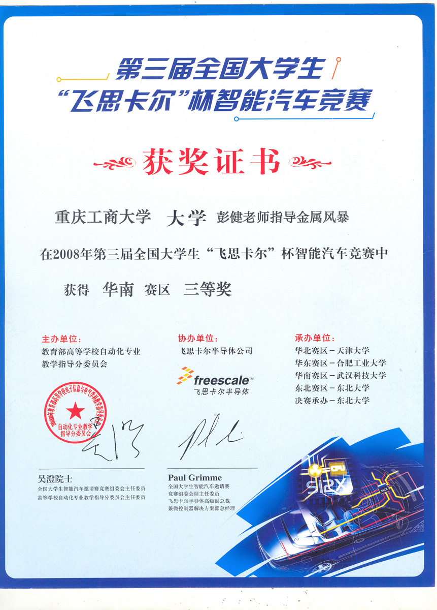 由教育部高等教育司主办的第三届全国大学生“飞思卡尔”杯智能汽车竞赛华南赛区的比赛于2008年7月23日在武汉科技大学体育馆落下帷幕。来自华南及西南地区11个省、自治区、直辖市的47所大学的 146支参赛队伍(光电组72支,摄像头组74支)参加了角逐。开云kaiyun官方网站机械与包装工程学院组队参加了此项比赛,并获得华南赛区的三等奖。