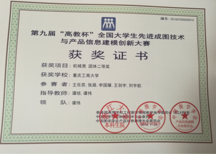 2016年7月23—26日,第九届“高教杯”全国大学生先进成图技术与产品信息建模创新大赛在山东理工大学举行,开云官网开云kaiyun官方网站王乐苏、张路、申国耀、王剑宇、刘宇航等五位同学组成的代表队在谭伟、谭琼老师的指导下,荣获机械类“团体二等奖”的优异成绩,同时获得个人全能一等奖1项,个人全能二等奖2项,个人建模一等奖2项,两位老师获得优秀指导教师奖。