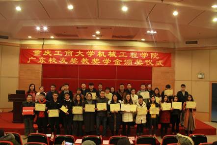 广东校友奖教奖学金由广东校友分会94届机制专业毕业校友钟仁东先生捐助100万元人民币设立,每年奖金20万元,其中奖教金为8000元每人,学生学习状元奖为4000元每人,优秀学生干部奖学金为2000元每人。本次奖教奖学金根据《广东校友奖教奖学金评选办法》,通过教师和学生申报、网络投票、学生投票、教师投票和学院党政联席会审议,廖兰、黄美娜、王旭东、刘静、张书彬、王洪建、向巧等7位教师获得奖教金;30名班级学习成绩第一名的学生获得学习状元奖;6名学生干部获得优秀学生干部奖学金。