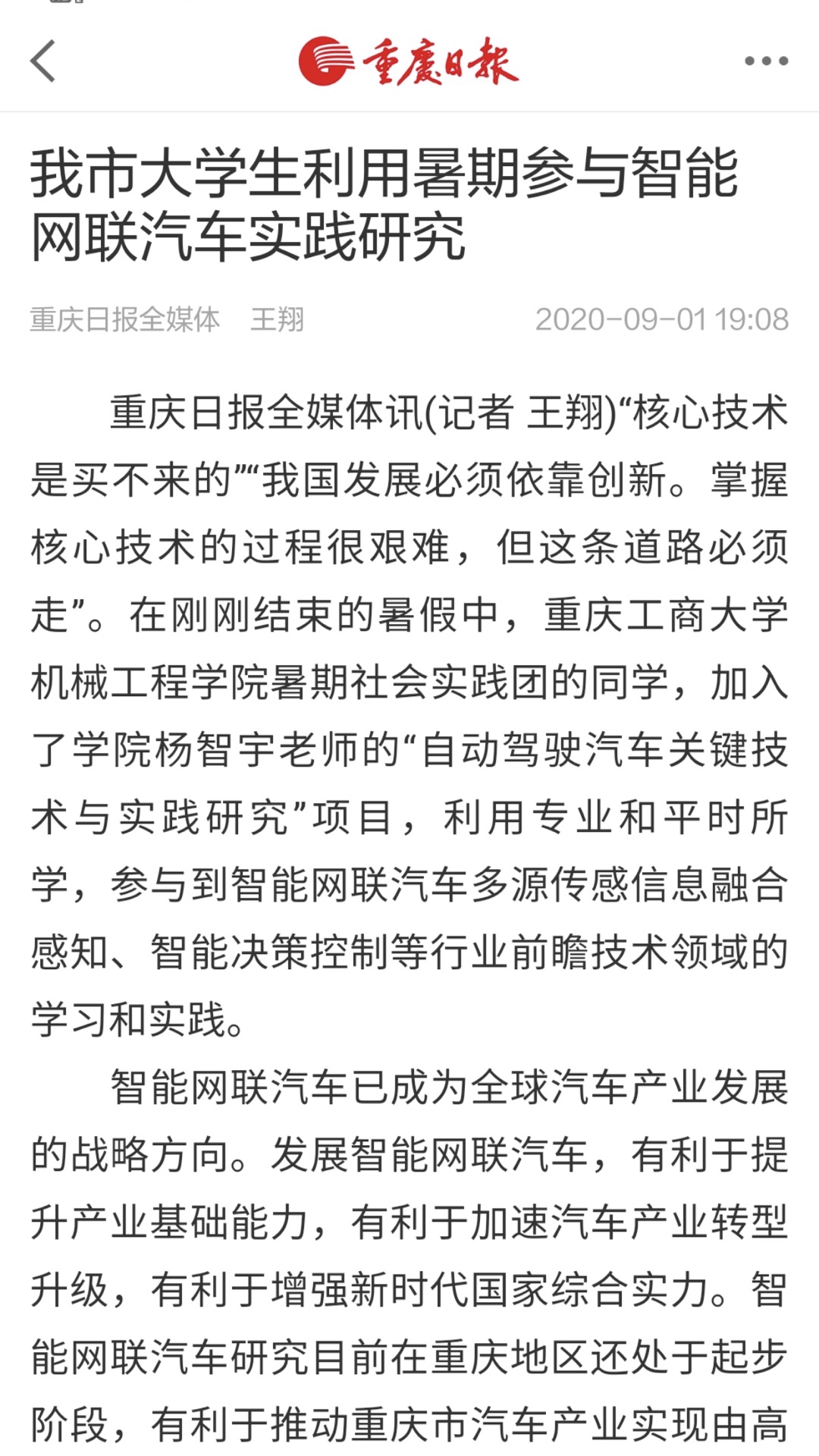 近日,《重庆日报》对开云kaiyun官方网站学生参与开云官网教师杨智宇的“自动驾驶汽车关键技术与实践研究”项目,共同开展智能网联汽车多源传感信息融合感知、智能决策控制等行业前瞻技术领域的实践研究进行了专题报道。智能网联汽车现已成为全球汽车产业发展的战略方向,相关研究目前在重庆地区还处于起步阶段,该领域研究具有巨大的产业需求,有利于推动重庆市汽车产业实现由高速增长向高质量发展转变,巩固重庆市汽车产业在全国的领先地位,增强汽车产业对全市经济发展的支撑作用。
