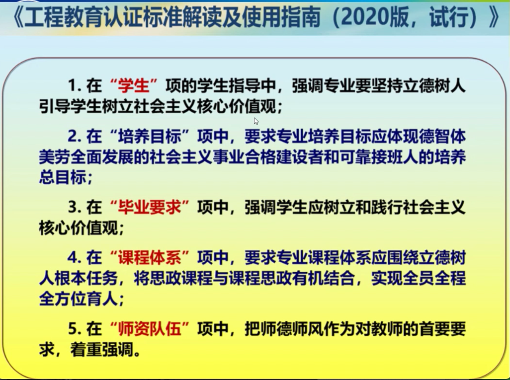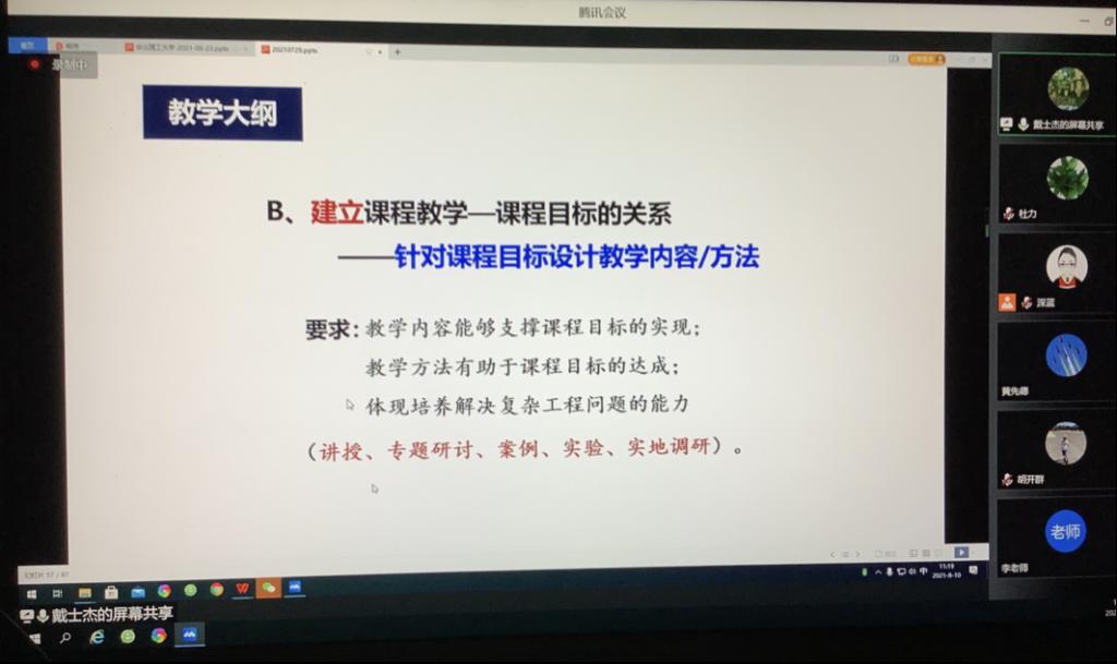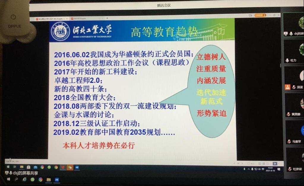 戴院长首先详细介绍了河北工业大学开云kaiyun官方网站的沿革和工程认证背景情况;然后详细分析了2020-2021年工程教育认证的新变化,深刻解读了《工程教育认证标准解读及实用指南(2020版,试行)》和《工程教育认证自评报告指导书(2020版)》的核心内容,并指导学院教师基于OBE进行培养方案和培养目标的制定、毕业要求指标点分解、支撑毕业要求的课程体系设计等工程认证实际操作。尤其是对任课教师的教学大纲撰写、教学过程设计、以及评价方法进行了详细讲解。下午,在戴院长的引导下,全体教师一起回顾了近年来党和国家对新时代高等教育的若干要求的举措”,分析表明随着高等教育发展的趋势,对认证工作的要求也不断升华和完善,“立德树人、注重质量、内涵发展、迭代加速、新范式、形势紧迫”等将是今后一个时期的关键词。戴院长还在线讲评了我院“机电工程专业工程教育认证申请书”初稿,提出初步修改意见。最后,戴院长还耐心解答了我院院长、教学副院长、系主任及学科负责人、实验中心负责人各方面的提问,帮助大家分析工程认证过程中产生的诸多疑虑。