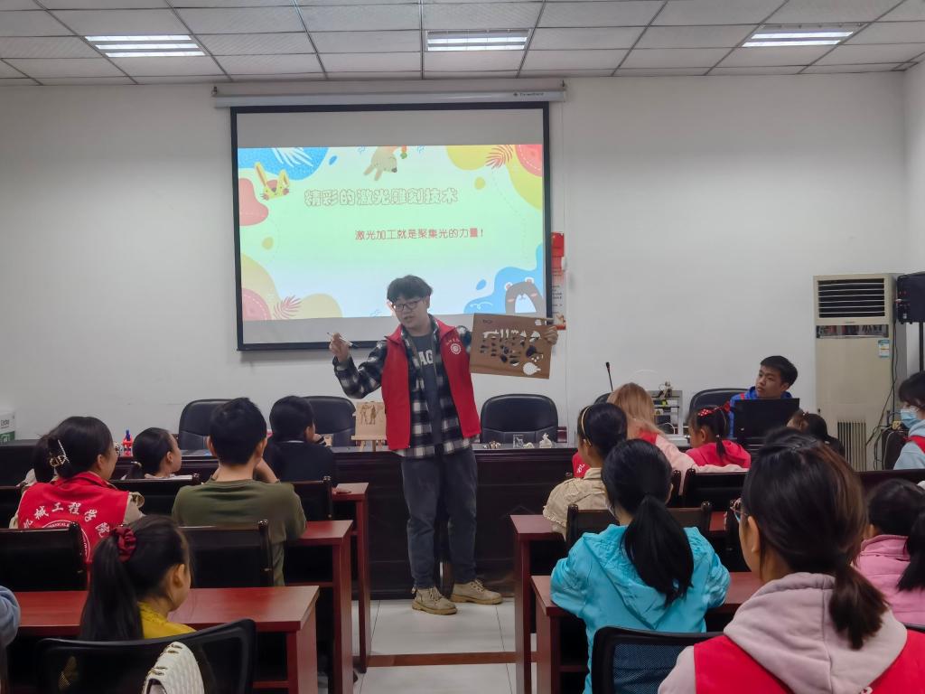 活动伊始,孩子们陆续来到活动地点,志愿者们牵着小朋友们的手走进教室,观看3D打印和激光雕刻的作品以及3D打印机的现场打印过程。第一堂课上,志愿者代表给小朋友们科普3D打印和激光雕刻知识,通过视频、图片加真实模型的结合,让小朋友们进一步了解现代科学技术,铸就科技之梦。课堂期间志愿者们拿出用激光雕刻打印模型和小朋友们一起拼接,锻炼小朋友们的动手能力。在志愿者们的协助下,作品顺利完成,小朋友们脸上也洋溢着快乐的笑容。第二堂课上,志愿者小讲师通过 ppt和视频结合,给小朋友们讲解吸水的彩纸和纸杯传声筒游戏的原理以及实验过程。志愿者们用提前准备好实验材料,让每个小朋友都亲自感受科学实验的魅力,志愿者们也时刻陪同照顾,帮助着小朋友进行实验。在一个个小实验中,小朋友们心中科技的种子已悄然萌芽,期待它的茁壮成长。活动尾声,志愿者与小朋友们合影留念。本次科普活动圆满结束。