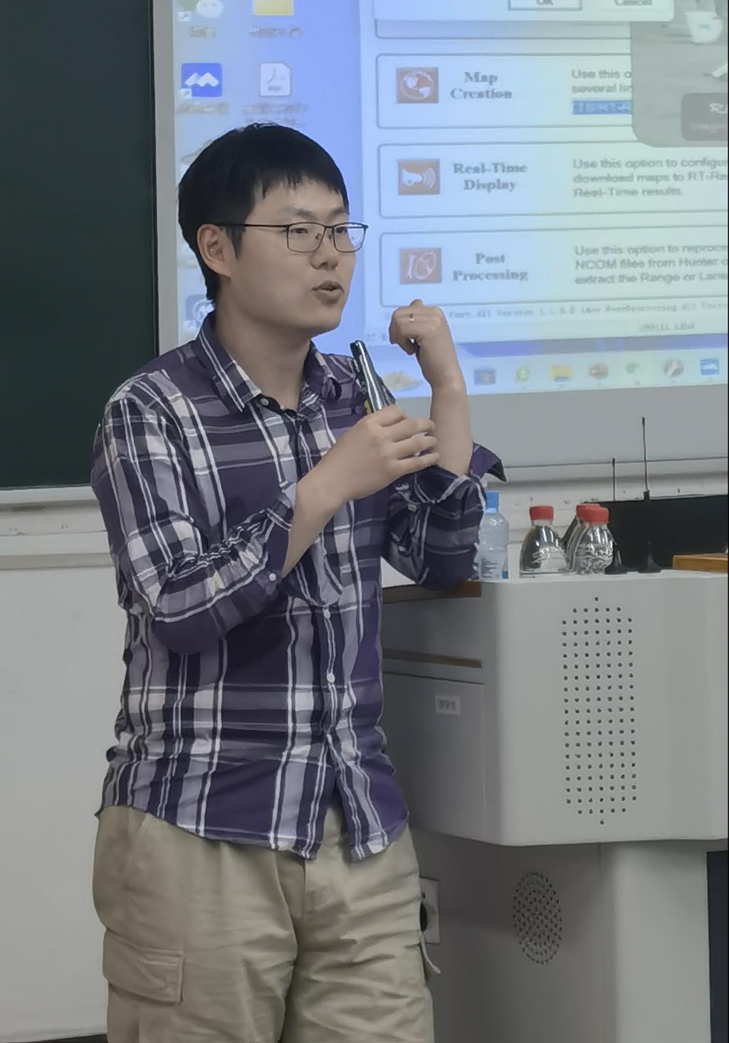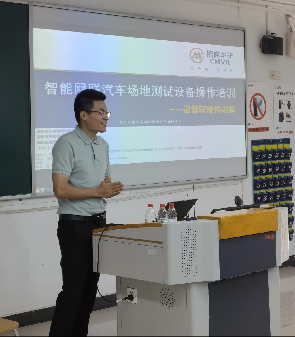 当日下午,招商车研的高级工程师、国家客车质量检验检测中心专家牛成勇为同学们开展了“智能汽车场地测试设备操作培训——设备软硬件讲解”主题讲座,讲座中结合未来几天实习过程中涉及的相关软硬件实践项向同学们介绍了相关预备知识,内容包括:ICV封闭场地测评技术概述、驾驶机器人系统、数据采集系统、测试目标物系统以及视频采集及记录系统等几部分,以帮助学生对实践内容及所涉及的软硬件形成初步概念,通过大量的展示与讲解激发了学生的好奇心并带着问题参与接下来的实践内容,进一步加强了本次实习的趣味性以及收获感,并为后续的实践教学打下了良好基础。