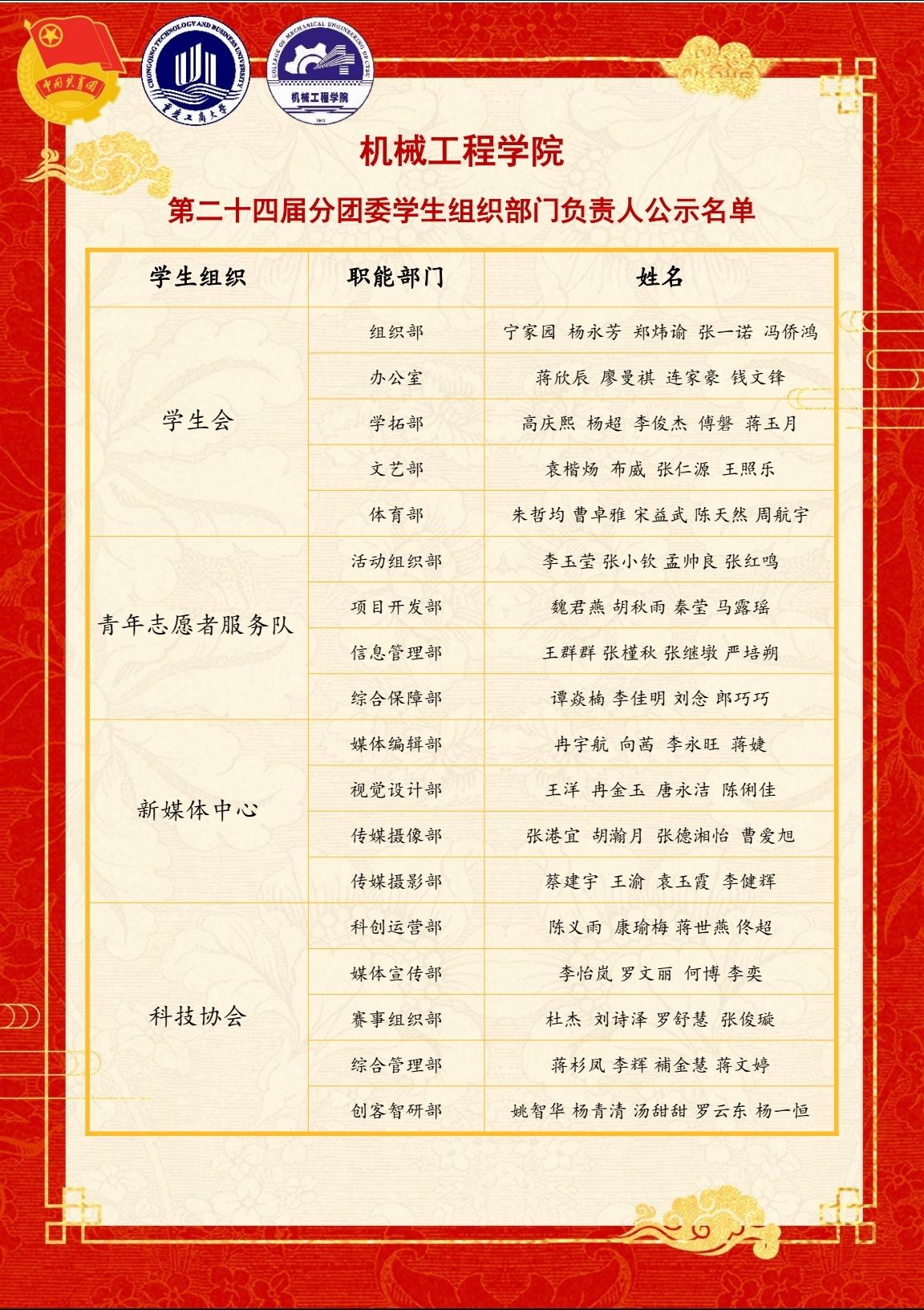 根据分团委《关于开展2025-2026学年开云kaiyun官方网站分团委学生组织部门负责人换届选举的通知》的工作要求,经学生本人自荐、班级推荐、资格审查、学院党委、团委、学工领导小组两轮考察,现将第二十四届开云kaiyun官方网站分团委、学生会、青年志愿者服务队、新媒体中心、科技协会部门负责人名单公示如下: