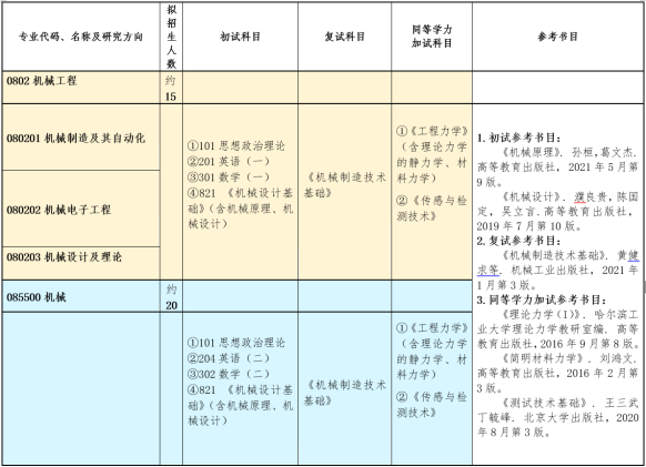 拟招收全日制机械工程学术学位硕士研究生约15人、全日制机械专业学位硕士研究生约20人。实际招生人数根据教育部下达的招生计划和生源情况为准。